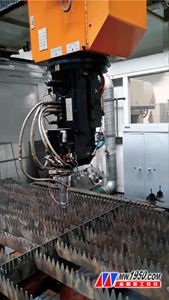 圖5 小三維件簡(jiǎn)易工裝 (3)激光切割系統(tǒng) 我廠的三維激光切割機(jī)床使用的是二氧化碳板條式激光器,激光發(fā)生器發(fā)出的激光需要經(jīng)過(guò)由設(shè)在機(jī)床各自軸上的反射鏡片組成的光路系統(tǒng)(所謂飛行光路)傳到激光切割頭的聚焦鏡上,再通過(guò)聚焦使平行光束變成光點(diǎn)照射在工件上,通過(guò)燒熔、吹屑等動(dòng)作完成切割工作。影響激光切割質(zhì)量的因素很多,激光的功率,模態(tài)頻率,整個(gè)光路系統(tǒng)的傳輸效率,穩(wěn)定性等,還有加工材料的光反射率,切割用氣體種類(lèi),氣體壓力,切割噴嘴的口徑大小,噴嘴的形狀,切割時(shí)的焦點(diǎn)位置,打孔的焦點(diǎn)位置,切割功率與速度的對(duì)應(yīng)等。這些是激光切割要考慮的因素,三維激光切割還需面對(duì)切割噴嘴與工件不垂直時(shí)加工狀態(tài)。這是由產(chǎn)品形狀與切割頭干涉所造成的,有時(shí)這種干涉使得加工無(wú)法順利完成,不得不更改工藝流程。三維激光切割對(duì)光路的準(zhǔn)確性要求高,即使機(jī)床的A軸(B軸)和C軸轉(zhuǎn)了很大的角度時(shí),光斑也要保證出現(xiàn)在噴嘴的中間位置,不能有大的偏差。 3.結(jié)語(yǔ) 通過(guò)三維激光切割設(shè)備的生產(chǎn)實(shí)踐,三維激光切割對(duì)加工效率的提升是非常顯著的。對(duì)于二氧化碳板條式激光切割系統(tǒng),激光器的各種性能光束的純度,能量的密度,高負(fù)荷時(shí)輸出的穩(wěn)定性,激光氣體的壽命與經(jīng)濟(jì)性,對(duì)電壓變化的適應(yīng)性等都將極大地提高三維激光切割的能力、質(zhì)量與效率。機(jī)床方面光路系統(tǒng)的傳輸效率,激光頭的靈活性,程序的易改與方便化,智能化都是用戶(hù)期待的,也是廠家應(yīng)該努力的方向。 作者簡(jiǎn)介:汪勇,一汽模具制造有限公司。