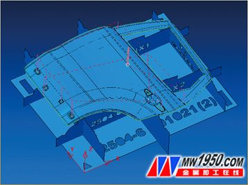 圖3 插板式支架切割車(chē)門(mén)外板 對(duì)于離線(xiàn)編程:使用編程軟件利用工件的數(shù)控模型編程(見(jiàn)圖3)。這種方式的優(yōu)點(diǎn)很多,首先,效率高,編程速度快;其次,不占用機(jī)床,可以提前編制多個(gè)程序,方便安排生產(chǎn);并且此類(lèi)程序方便更改,對(duì)稱(chēng)工件無(wú)需要重復(fù)編程。相比示教編程,不需要全尺寸的刻線(xiàn)件,只需要幾個(gè)刻線(xiàn)點(diǎn)(三個(gè)以上)即可。但這種編程方式準(zhǔn)確度低,后期改動(dòng)大。因?yàn)殡x線(xiàn)編寫(xiě)的程序在機(jī)床加工時(shí)對(duì)程序坐標(biāo)系的定位是通過(guò)實(shí)際采集刻線(xiàn)點(diǎn)的機(jī)床坐標(biāo)值與數(shù)據(jù)模型中的理論坐標(biāo)值進(jìn)行比對(duì),通過(guò)某種算法擬合程序。也就是說(shuō),它會(huì)對(duì)實(shí)際工件的偏差做出相對(duì)應(yīng)的調(diào)整,使程序的軌跡更貼近于實(shí)際工件。但是這種策略幾乎可以肯定,實(shí)際加工出來(lái)的工件會(huì)有所偏差。而數(shù)據(jù)點(diǎn)的采集一般設(shè)在較容易采集區(qū)域,只是根據(jù)這三個(gè)點(diǎn)間偏差來(lái)回移動(dòng)坐標(biāo)系,難免無(wú)法顧及全部。因此,在實(shí)際生產(chǎn)中,必須對(duì)程序進(jìn)行調(diào)整。 (2)工裝支架 工裝支架通常有兩種制作方式。一種是插板式的,即通過(guò)切割出對(duì)應(yīng)產(chǎn)品形狀的鋼板,彼此拼搭而成。這種方法速度快,效率高,是一種粗定位。另一種是用鋼筋(管)焊在底座上和產(chǎn)品搭接部分或使用舊件的一部分(手工切割下來(lái)),或使用樹(shù)脂塊和產(chǎn)品貼附。這種方法更貼近實(shí)際工件。三維激光切割主要面對(duì)的是拉延件,無(wú)法用銷(xiāo)子等孔來(lái)定位,只能靠工件的形狀來(lái)定位,而薄板件的變形量又比較大,所以生產(chǎn)中在支架上輔以磁鐵等加強(qiáng)定位,如圖4、圖5所示。